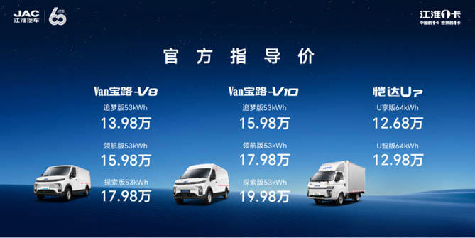 憑借13年深厚的新能源商用車研發、制造和推廣積淀,江淮1卡多動力技術路線并舉,正向開發純電平臺及混動平臺,推出覆蓋微卡、小卡、輕卡、van等系列新能源產品,滿足多元化、全場景用車需求。面向蓬勃發展的綠色城配市場, 江淮1van Van寶路新能源物流車和愷達U7新能源轎卡乘勢而來。