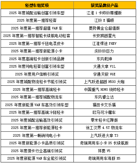 為順應行業電動化、智能化、網聯化、場景化發展趨勢,推動輕型商用車市場轉型升級,輕型車組創新設立了“2025年度城配運輸創富引領車型”、“2025年度新能源VAN車高效引領車型”、“2025年度高端輕卡創新引領品牌”、“2025年度純電輕客創富引領車型”、“2025年度用戶信賴引領獎”、“2025年度城配物流輕卡節能引領獎”、“2025年度微卡行業高端引領獎”等細分領域獎項。