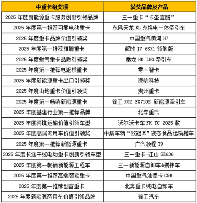 因此,以創新激活發展新動能,釋放平臺長遠生命力,成為第一商用車網年度評選活動與時俱進的關鍵內核。而這份創新活力,在獎項設置中展現得淋漓盡致。為積極響應國家政策導向,深度落實新質生產力發展要求,助力卡車行業高質量發展,年度評選組委會在中重卡組設置了“2025年度新能源重卡服務創新引領品牌”、“2025年度重卡品牌價值引領獎”、“2025年度燃氣重卡品質引領獎”、“2025年度新能源重卡出口引領獎”、“2025年度跨境運輸價值引領車型”、“2025年度高端專用車價值引領獎”、“2025年度山地重卡價值引領獎”等重磅獎項。
