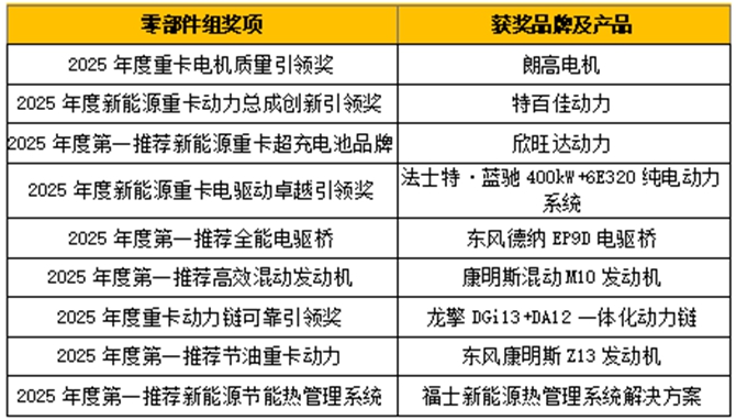 同時,為加速商用車行業綠色化、高效化與低碳化轉型進程,零部件組評選緊扣行業發展趨勢及核心需求,聚焦動力系統、核心總成等關鍵領域,針對性地設立了“2025年度新能源重卡動力總成創新引領獎”、“2025年度重卡電機質量引領獎”、“2025年度新能源重卡電驅動卓越引領獎”等年度獎項,全方位覆蓋產業鏈關鍵環節。