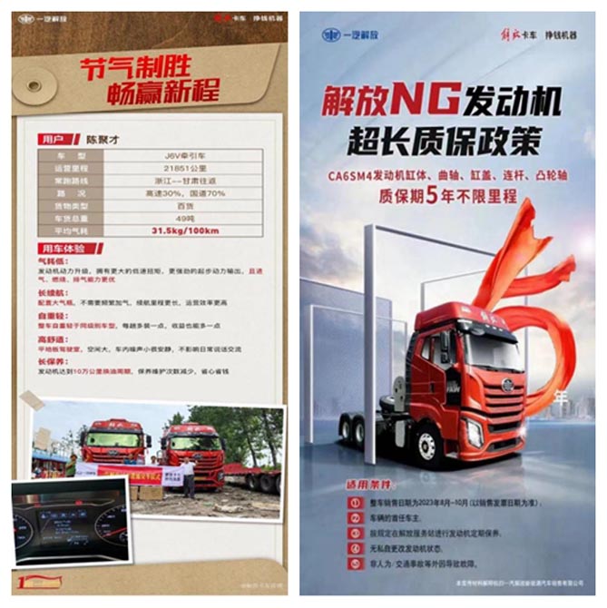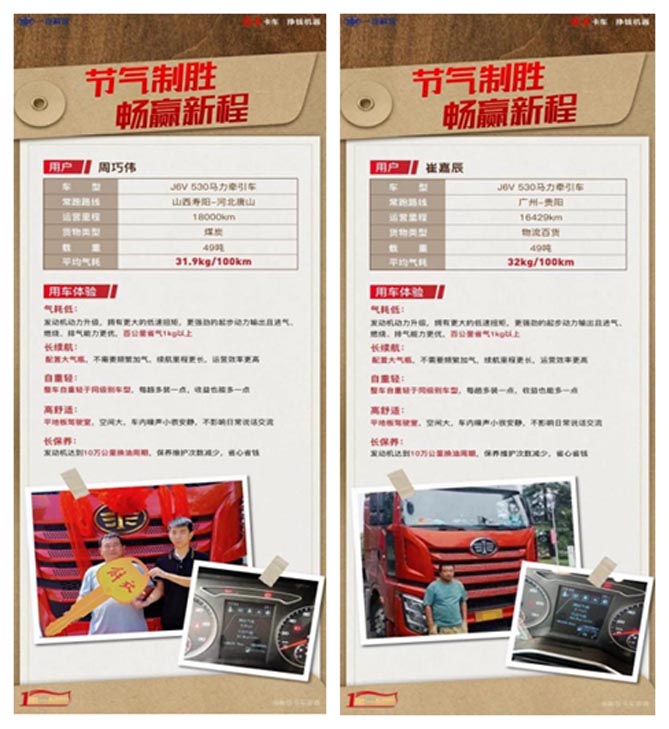 新品搭載了CA6SM4系列的530馬力天然氣發(fā)動機(jī),最大扭矩可達(dá)2500N·m,起步動力輸出更為強(qiáng)勁。此外,發(fā)動機(jī)10萬公里長換油周期、火花塞20萬公里長壽命、50萬公里冷卻液更換周期指標(biāo),此“三項(xiàng)”技術(shù)突破,使得該車成為全生命周期成本領(lǐng)先的國產(chǎn)重卡典范。一經(jīng)上市,便以卓越性能和低氣耗硬核實(shí)力贏得眾多卡友的青睞,用戶也紛紛通過曬氣耗,證明這款精英重卡真正符合“解放卡車,掙錢機(jī)器”的美譽(yù)!不妨,讓我們傾聽他們的真實(shí)反饋。