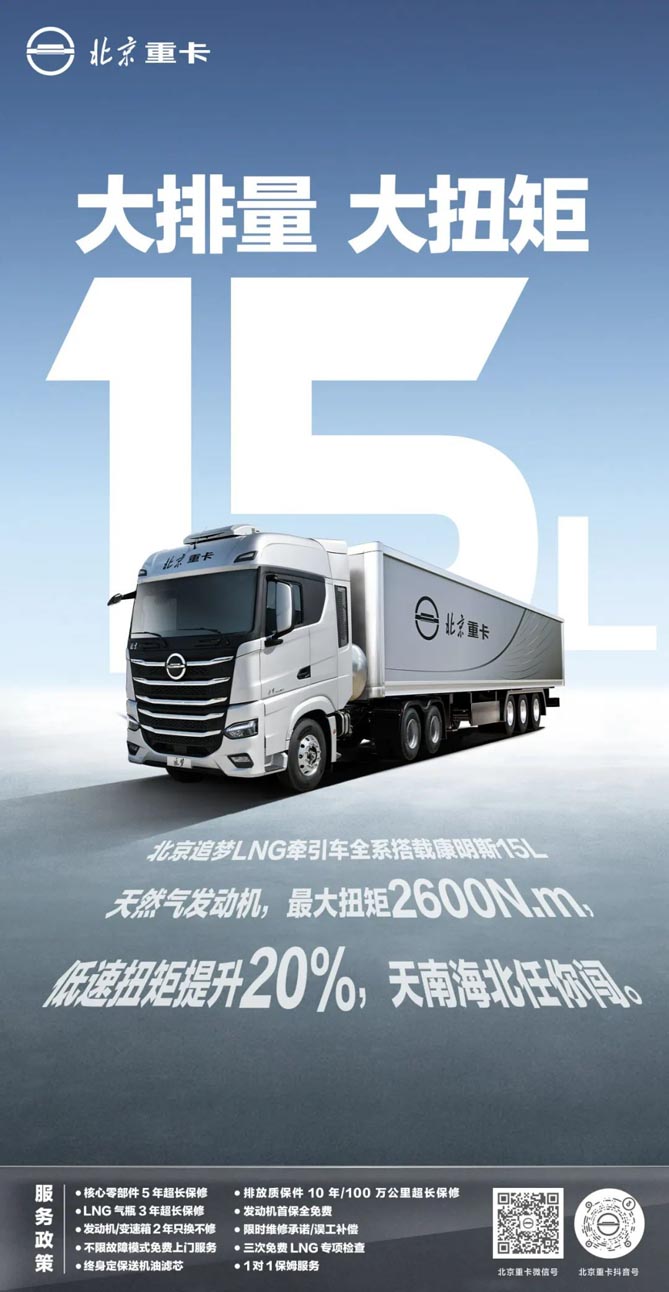 以i-Beijing整車數(shù)智統(tǒng)領(lǐng),搭載全球同步的康明斯X15N燃?xì)獍l(fā)動機(jī)和采埃孚第4代TraXon自動變速箱。