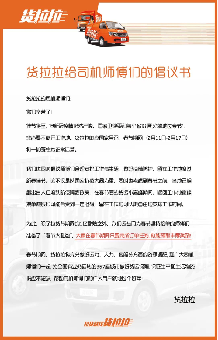 新春佳節(jié)將至,但新冠疫情形勢依然不容小覷。國家衛(wèi)健委和多個(gè)省份倡議“就地過春節(jié)”,非必要不離開工作地。近日,貨拉拉也發(fā)出倡議書,呼吁平臺司機(jī)做好疫情防護(hù),就地過春節(jié)。為了讓司機(jī)師傅安心就地過年,貨拉拉準(zhǔn)備了總價(jià)值1億元的新春拉貨節(jié)福利和春節(jié)大禮包激勵(lì)留守工作地并積極接單的司機(jī)師傅。