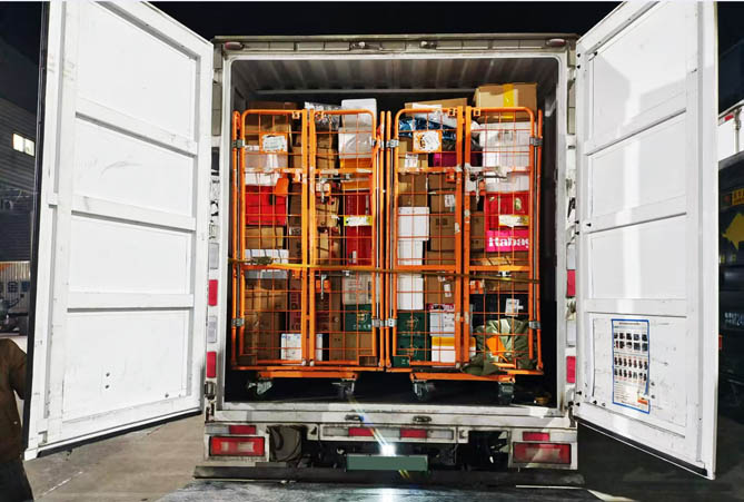 今心物流運營線路,主要是往返紹興越城區、科橋區、諸暨等配送點。快遞包裹大多屬輕拋貨,車輛到達轉運點后,貨物從輸送線上下來,到貨臺用籠車裝好,裝卸人員落下車輛尾板,便將其送到廂車內。